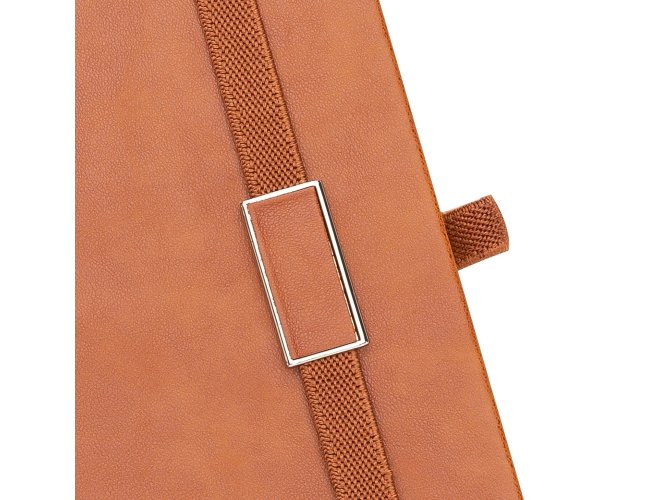 Caderneta emborrachada com suporte para caneta. Contém aproximadamente 96 folhas amarelas sem pauta, suporte de nylon para caneta (não acompanha), marcador de página em cetim e elástico para lacre com plaquinha de centro emborrachado.