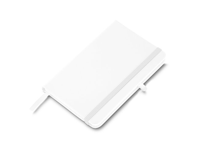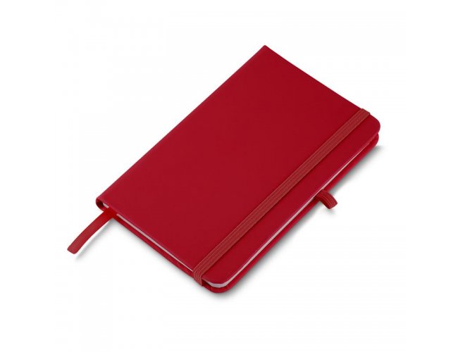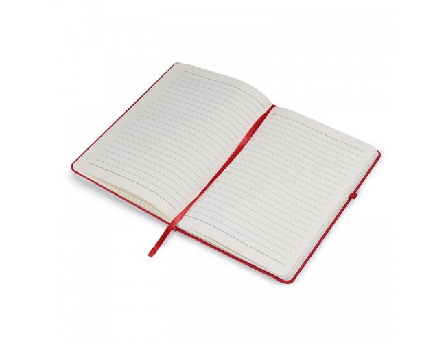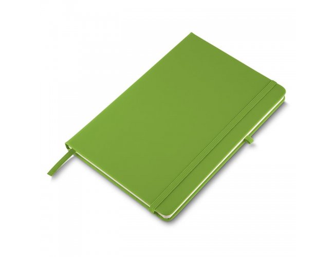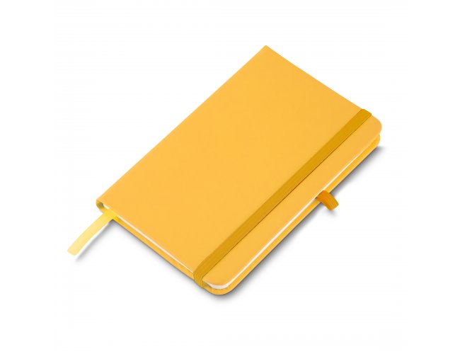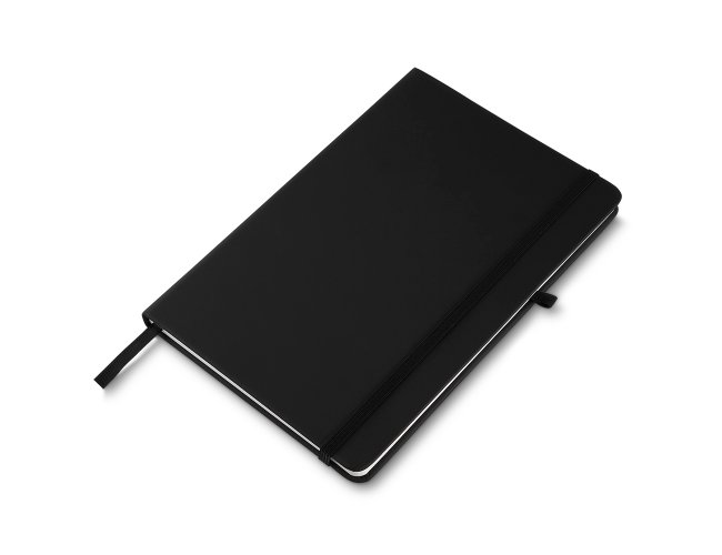Caderno de anotações com elástico no tamanho A5, suporte para caneta, capa dura em material sintético, miolo 80 folhas pautadas na cor bege.