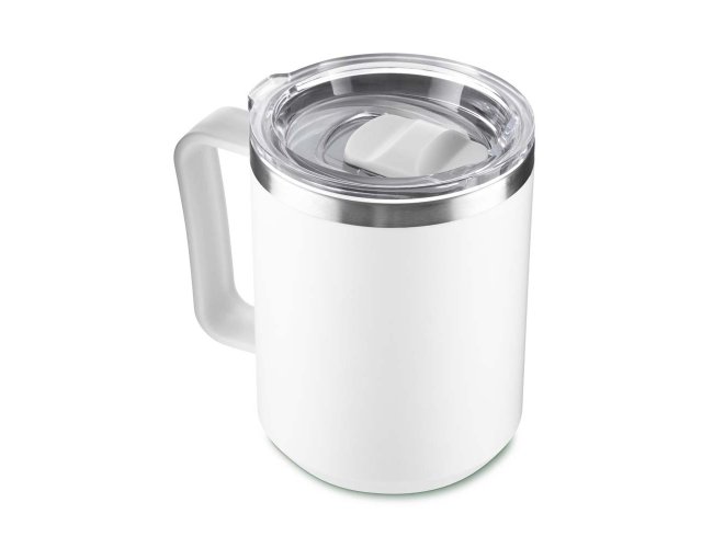 Caneca produzida em plástico PP de 450ml com interior em inox 304 para conservação da temperatura do líquido. Possui alça ergonômica e tampa plástica com vedação de encaixe.