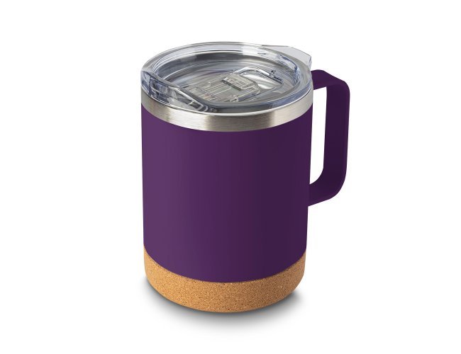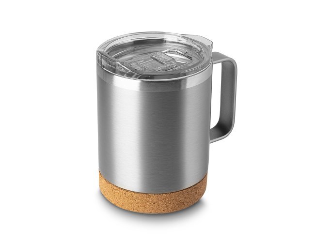 Caneca térmica em aço inox com capacidade 350ml, parede externa com pintura a pó. Parede dupla isolada à vácuo, tampa plástica com anel em silicone para vedação, alça lateral em inox na cor do produto, base em cortiça.