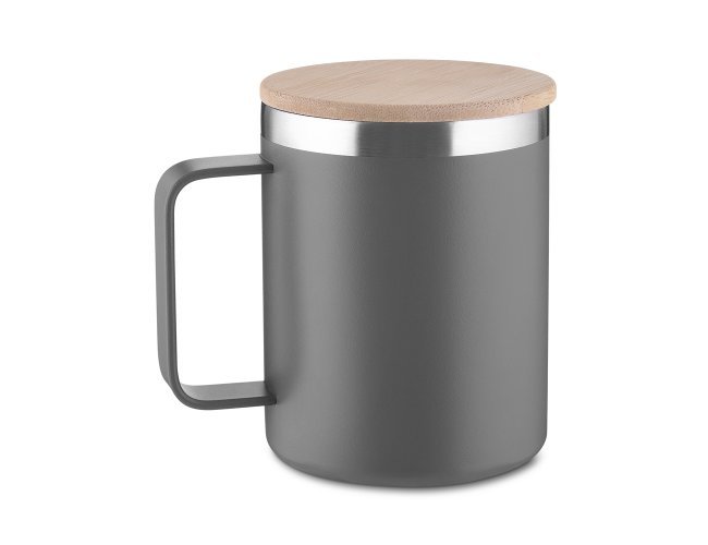 Caneca térmica 400ml, produzida em inox reciclado (304 interno / 201 externo), com tampa em bambu, pintura a pó.
