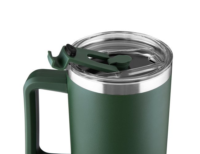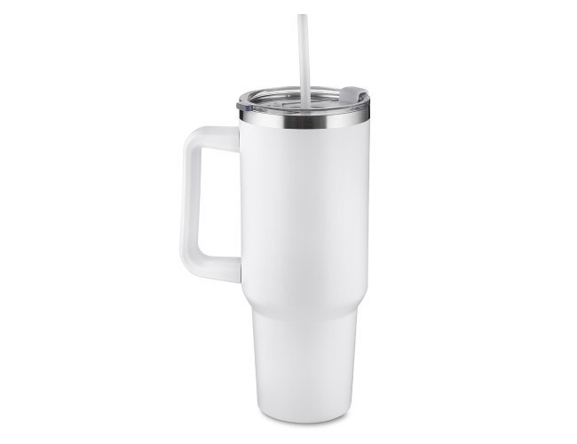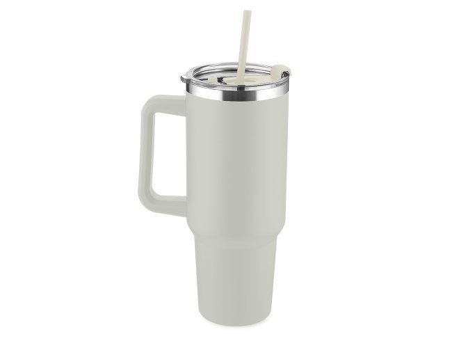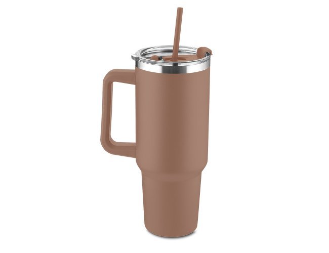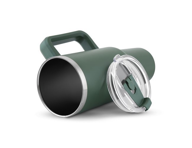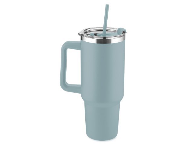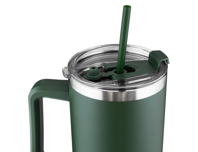 Caneca térmica de 1,3 litros em inox reciclado com parede dupla (interno 304, externo 201), acabamento em pintura a pó, tampa e canudo em plástico PP na cor do produto.