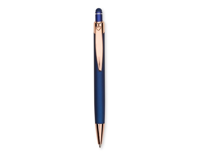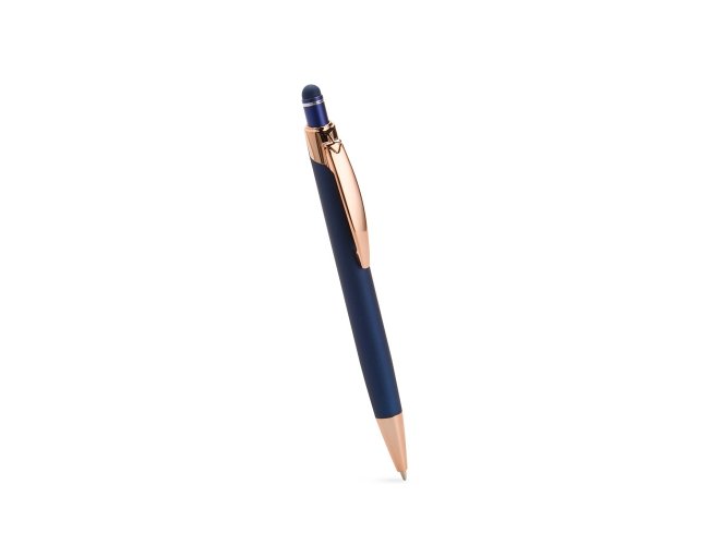 Caneta metálica com carga esferográfica azul de 1,0mm e acionamento por clique de revestimento emborrachado para interação em dispositivos com telas sensíveis ao toque.