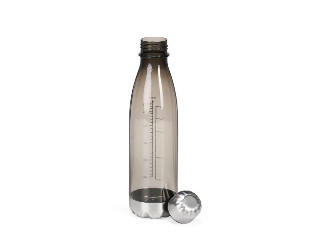 Garrafa plástica translúcida com capacidade máxima de 750ml e marcação de volume até 700ml. Conta ainda com base e tampa rosqueável em alumínio.