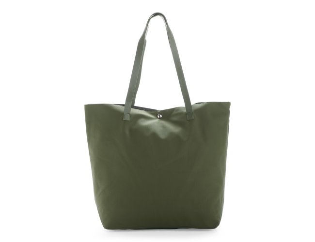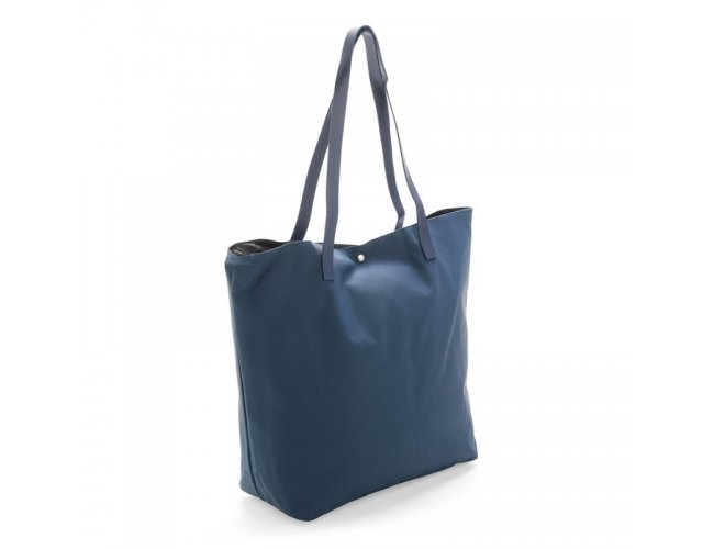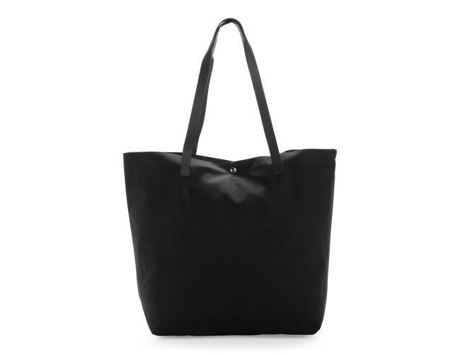 Sacola confeccionada em couro sintético à base de PVC com par de alças de costura externa e botões magnéticos metálicos para fechamento. Possui revestimento interno em poliéster e bolso compacto com fechamento em zíper.